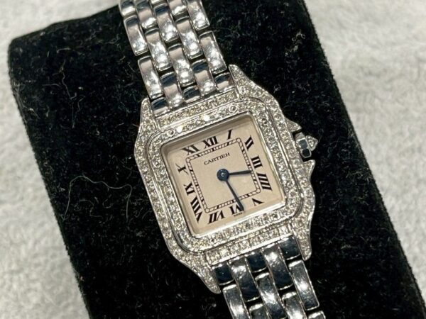 今回お持ち込みいただいたのは、カルティエ(CARTIER) パンテールSM アフターダイヤベゼル ステンレススチール クオーツ シルバー文字盤。パンテールは、カルティエを代表するアイコニックなコレクション。